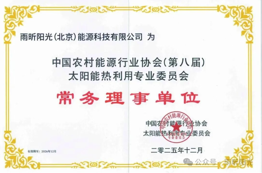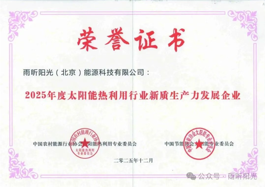 2025年12月18日,中国太阳能热利用行业年会在青岛隆重开幕。本届年会以“不忘初心、团结奋进、新质发展”为主题,汇聚了行业协会领导、专家学者与企业代表,共同探寻太阳能产业的高质量发展之路。作为中国农村能源行业协会太阳能热利用专委会常务理事单位,雨昕阳光受邀出席本次盛会,并凭借突出的行业贡献与创新成果,一举荣获“新质生产力发展企业”“太阳能热利用诚信企业”及“草根精神杯”等多项荣誉。
